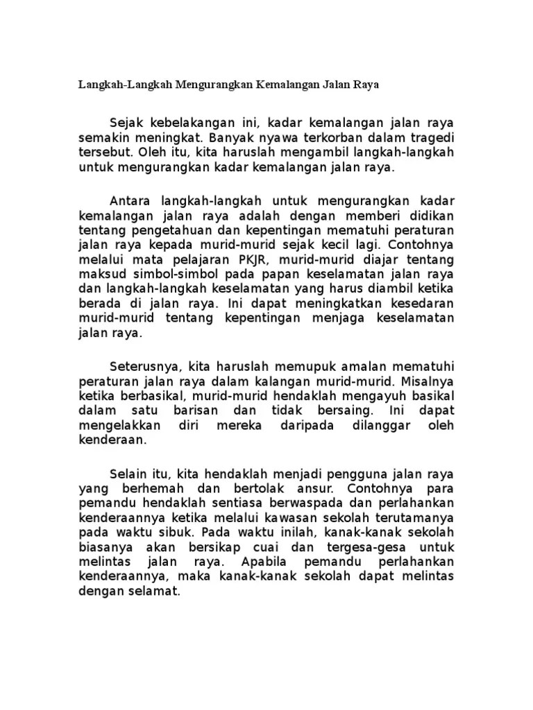 Fyi i have future my study to college so i can't really . Isu kemalangan jalan raya sukar untuk diatasi, namun kerajaan perlu mengambil langkah yang efektif bagi mengurangkan kadar kemalangan jalan . Terdapat pelbagai langkah untuk mengurangkan kemalangan jalan raya. Didikan kepada para pemandu 2. Contoh karangan langkah untuk mengurangkan kemalangan jalan raya kemalangan jalan raya yang berlaku telah menyebabkan kecederaan, kematian serta kerosakan . Mematuhi peraturan jalan raya dan cara pemanduan yang betul. Apakah cara yang boleh mengurangkan kemalangan jalan . Kemalangan jalan raya yang serius boleh meragut nyawa seseorang yang tidak berdosa. Kemalangan jalan raya boleh mengakibatkan tragedi ngeri kepada sesiapa. Kemalangan jalan raya adalah dengan memberi didikan tentang pengetahuan dan kepentingan mematuhi peraturan